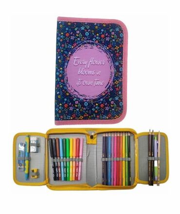 Pernica sa dva preklopa, idealna za organizaciju školskog pribora. Spoljašnjost je tamnoplave boje sa cvetnim dezenom i motivacionom porukom. Unutrašnjost pernice je žute boje, podeljena na pregrad...