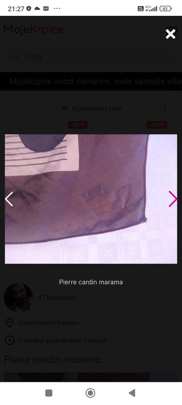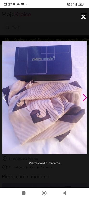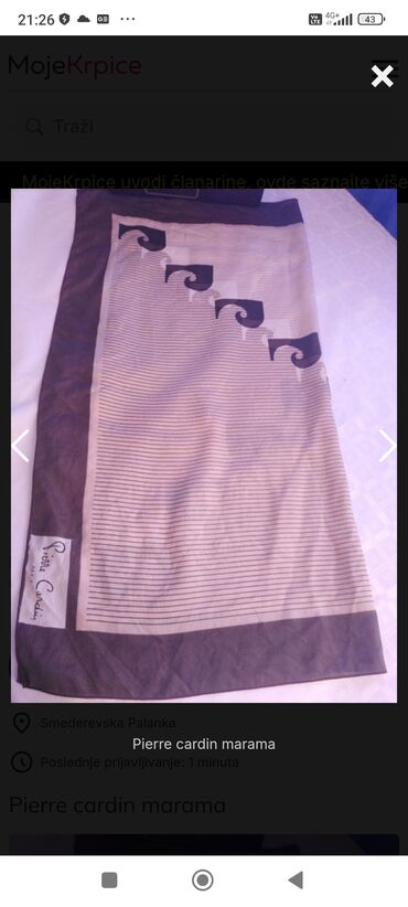 O trošku kupcaSNIŽENO.! ORIGINAL Pierre cardin marama 64x67cm,....sitni tragovi nosenja... Pogledajte ostale moje predmete na profilu.