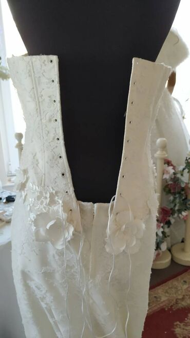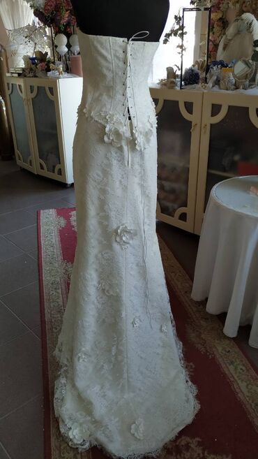 Boja slonovačeTop korset venčanica boje slonovače sa malim šlepom pozadi. Klasična elgancija. Haljina je od svilenkastog materijala sa aplikacijama 3d čipke. Kopča se pertlanjem i ima mogućnost proširenja. Nošena je jedanput, oprana i ispeglana, u odličnom stanju.