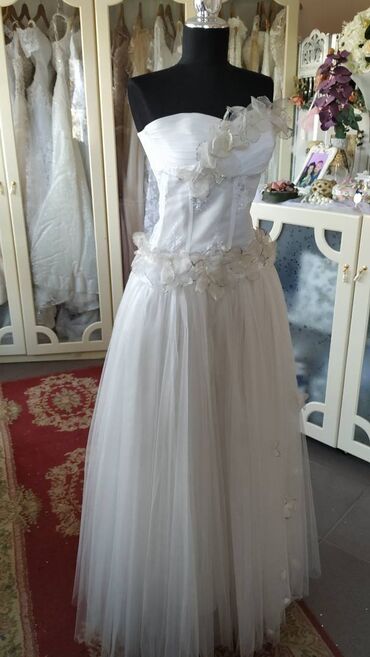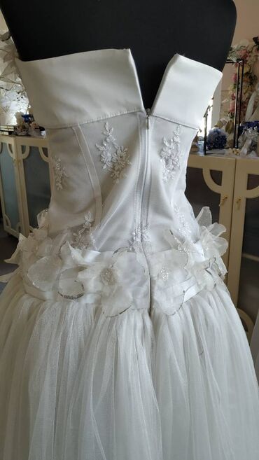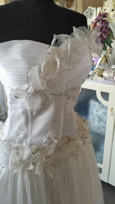 Top venčanica snežno bele boje sa lepršavom suknjom od tila. Gornji deo je od krućeg materijala sa aplikacijama od čipke i 3d cvetova u boji slonovače sa srebrnim obodom. Haljina je idealna za vitku devojku sa bogatijim poprsjem. Pozadi se zakopčava rajsferšlusom. Haljina je barem jedanput nošena. Oprana i ispeglana i u odličnom je stanju.