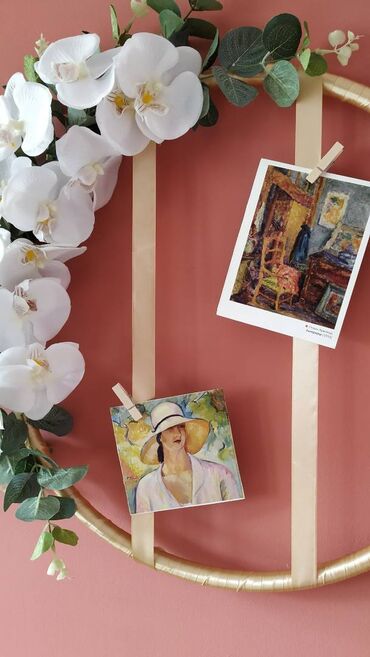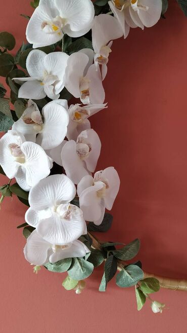 Ukras za zidDekorativni venac sa veštačkim cvećem, orhideje i eukaliptus, prečnika 35 cm. Moguće je dodati trake za kačenje slika.