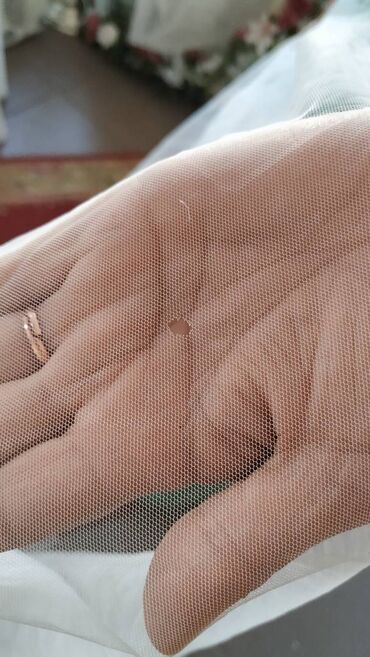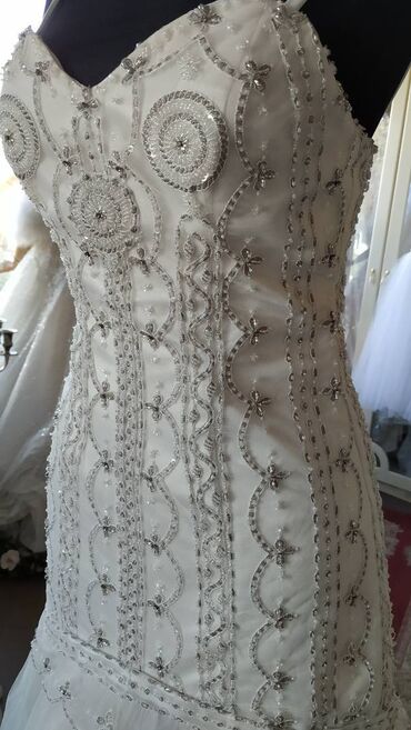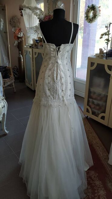 Venčanica snežno bele boje sa bratelema, srcolikog izreza dekoltea, sirena kroja. Lepršavi til u donjem delu i aplikacije sa cirkonima u art deko stilu na gornjem delu haljine. Haljina se pertla na ledjima, jedanput je nošena, oprana i ispeglana. Postoji rupica na spoljnjem tilu pozadi.