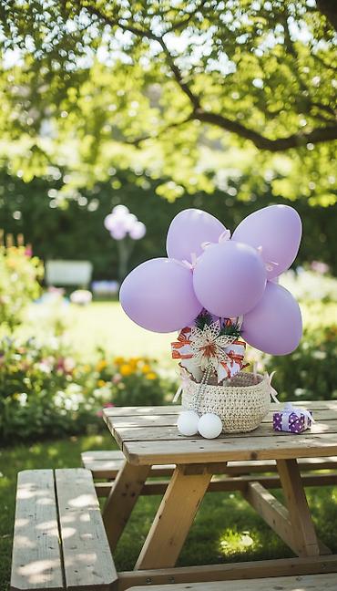 - Aranžman ljubičastih balona (više komada) pričvršćenih satenskim trakicama u svetloružičastoj boji.