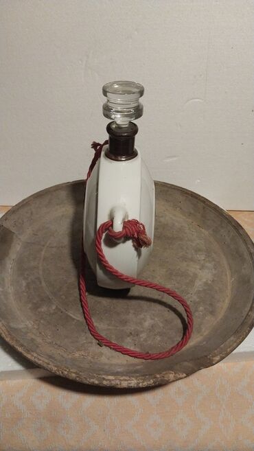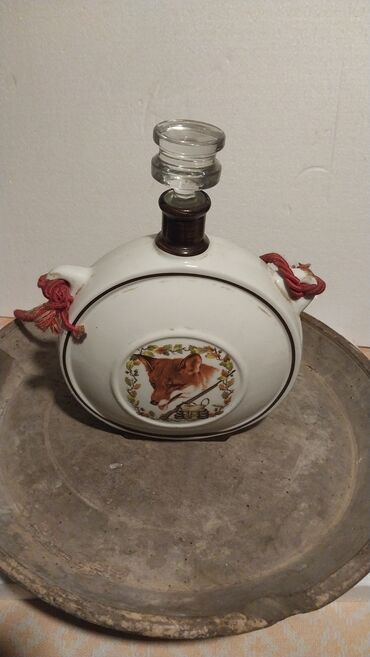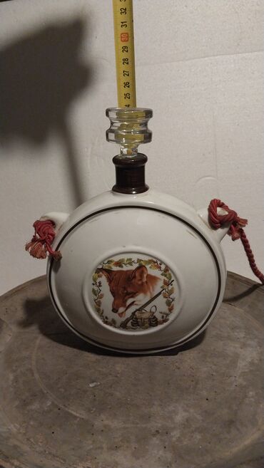 Unikatan dekorativni predmet sa lovačkim motivima, pogodan za zbirke, rustic/etno enterijer ili praktičnu upotrebu kao čutura/dekanter.