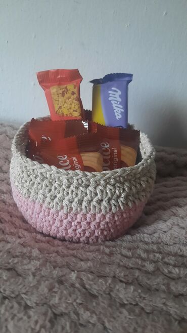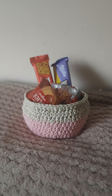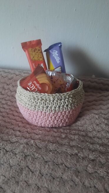 Ručna heklana korpica za odlaganje. - Dizajn: dvobojna – donji deo u nežno roze, gornji u bež tonu sa diskretnim sjajem u niti. - Materijal: debela pamučna/akrilna pređa heklana u čvrstom bodu za ...