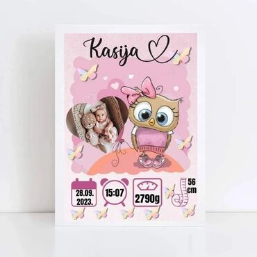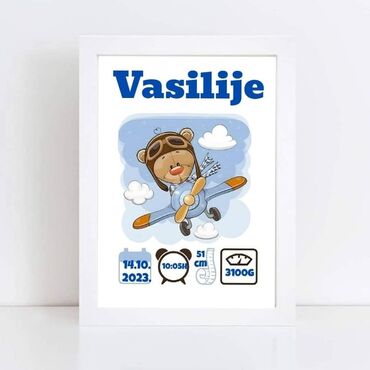 Sadržaj postera je prilagodljiv imenu i podacima deteta, sa nežnim, veselim ilustracijama koje ističu najvažnije trenutke rođenja.