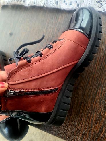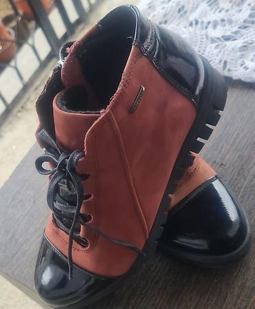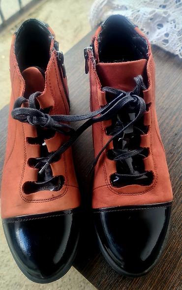 - Materijali: gornjište od baršunaste brušene kože u toploj rđasto-crvenoj nijansi; lakovana crna koža na kapici i peti; crna tekstilna pertla