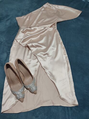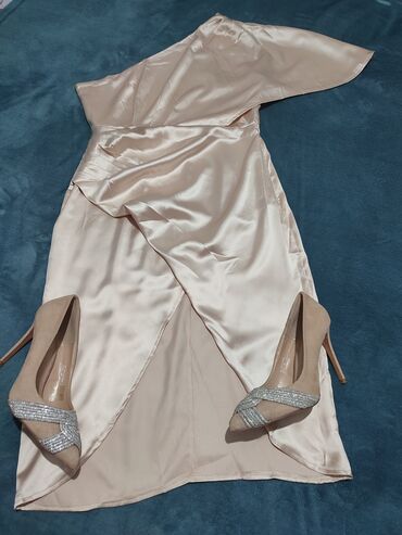 Idealno za svadbe, proslave i svečane večernje prilike. Kombinacija neutralnih tonova olakšava usklađivanje sa torbicom i nakitom. Haljina je nova, nikad nošena, samo skinuta etiketa. Salonke nošene samo jednom. Bez oštećenja.