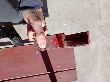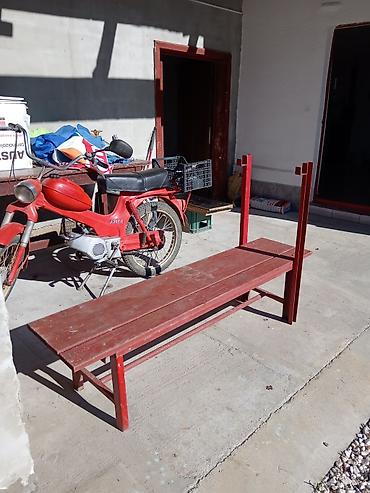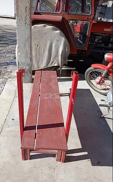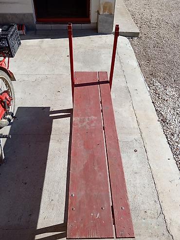 - Konstrukcija: masivno drvo (dve uzdužne daske) na čeličnom ramu, sve farbano u crveno.