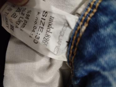 - Detalji: klasičan petodžepni dizajn, metalno dugme i nitne, konac u kontrastnoj boji, crvena DSQUARED2 traka kod šlica, kožni/metalni brendirani bedž pozadi, unutrašnja etiketa sa modelom i sastavom