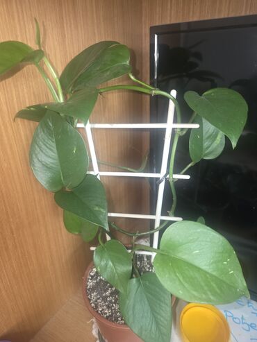 - Epipremnum (zeleni pothos): snažna puzavica postavljena na belu rešetkastu potporu za usmeravanje rasta. Sjajni tamnozeleni listovi, pogodna za oplemenjivanje prostora, lako se oblikuje i razmnožava reznicama u vodi ili supstratu.