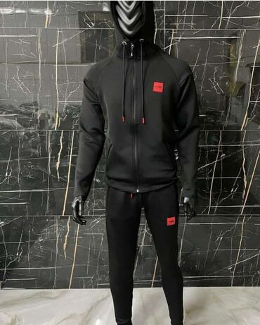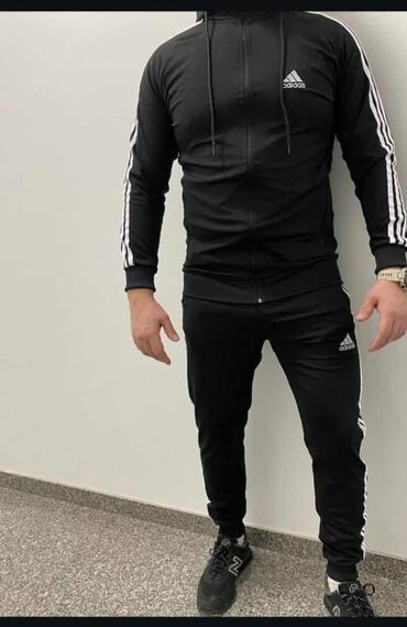 - Kompleti trenerki sa rajsferšlusom: crna varijanta sa kapuljačom, uskim nogavicama i elastičnim ranflama; bočne pruge duž rukava i nogavica; diskretan logotip na grudima i butini.