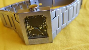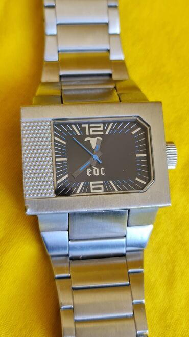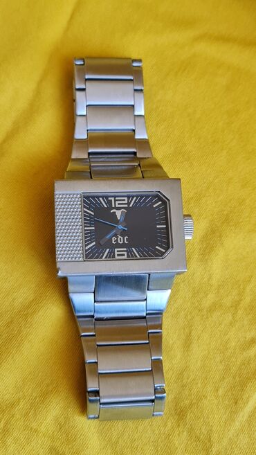 - Narukvica: široka metalna (brušeni čelik izgled), segmentna, sa sklopivom kopčom; na kopči ugravirano „edc“.