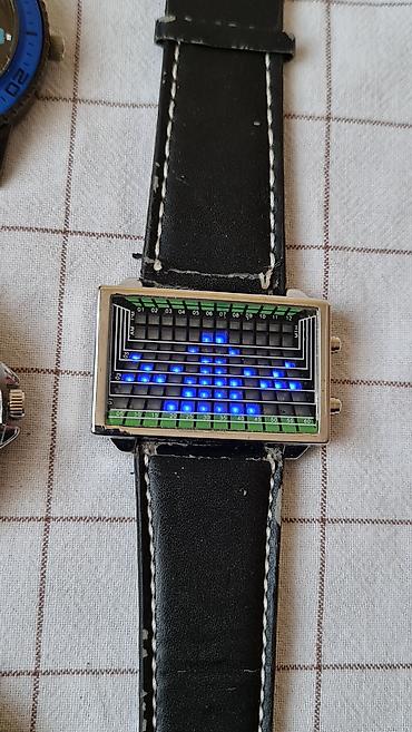 - Sat 4: Pravougaoni digitalno-analognog izgleda sa stepenastim/linijskim prikazom na maski u zeleno-crnoj kombinaciji. Dugmad sa desne strane. U kompletu sa crnim kožnim kaišem sa belim štepom i klasičnom kopčom.