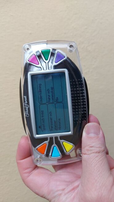 - Originalni Trivial Pursuit uređaj sa LCD ekranom i karakterističnim šarenim tasterima u obliku „pie“ segmenata.