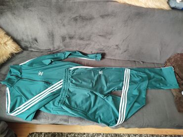 - Model: klasični Adidas set sa tri bele linije duž rukava i nogavica, Adidas Trefoil logo na grudima i boku pantalona