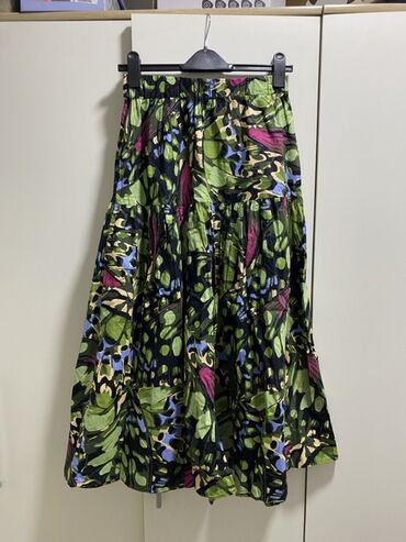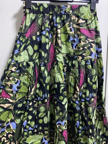 Šarena ženska suknja sa elastičnim pojasom. Suknja je ukrašena apstraktnim geometrijskim šarama u različitim bojama, uključujući plavu, crvenu, zelenu i žutu. Elastični pojas omogućava udobno nošen...