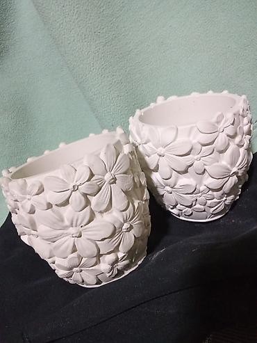 - Dva okrugla modela saksija sa bogatim reljefom cvetova po celoj spoljašnjoj površini. Idealne za sobne biljke, sukulente ili kao dekorativne posude. Glatka unutrašnjost, ivica sa sitnim ukrasnim ispupčenjima. Pogodne za farbanje akrilnim bojama, patiniranje ili lakiranje.