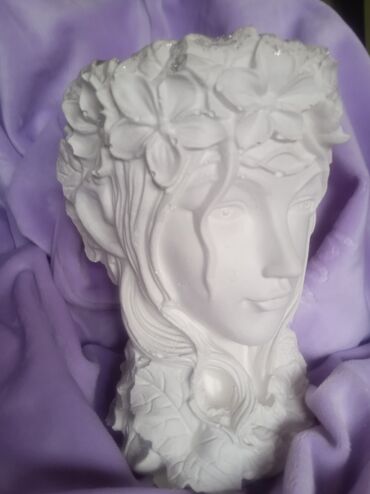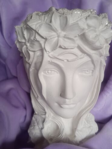 Dekorativne saksije i ukrasne figurice od gipsa/betona – ručno rađeni komadi u beloj boji, sa finom teksturom i reljefnim detaljima. - Saksije u obliku ženske glave: nežne crte lica i talasasta ko...