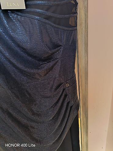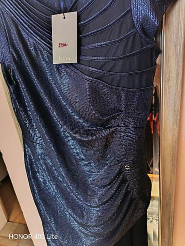 Elegantni večernji kombinezon sa sjajnim efektom i asimetrično drapiranom gornjom tunikom. Gornji deo ima dekorativne aplikacije u vidu slojevitih traka, V-izrez i kratke rukave, dok donji deo čine široke nogavice u punoj dužini. Na boku diskretan metalni LUNA detalj.