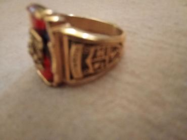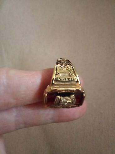 Muški prsten sa reljefnim grbom i dekorativnim crvenim kamenjem