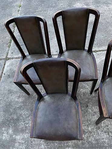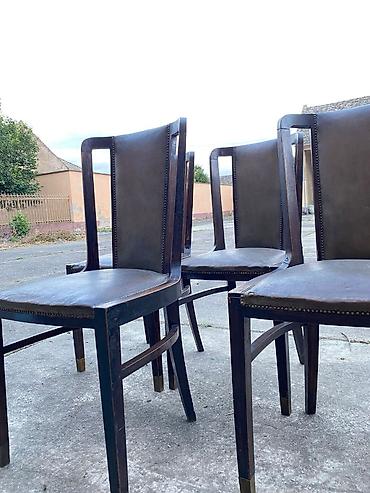 Stolice su takođe od drveta, sa kožnim sedištima i diskretnim mesinganim detaljima na donjem delu nogara, što im daje elegantan izgled.
