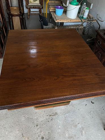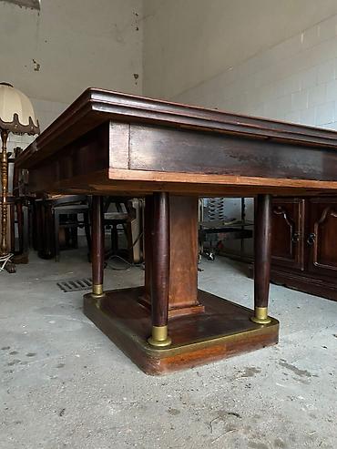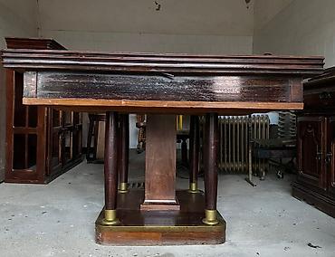 Na prodaju trpezarijski set koji čine sto i 6 stolica. Sto je izrađen od punog drveta sa dekorativnim detaljima od mesinga, stabilan i očuvan.