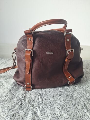 - Boja: tamno braon telo, konjak braon remenje i ručke