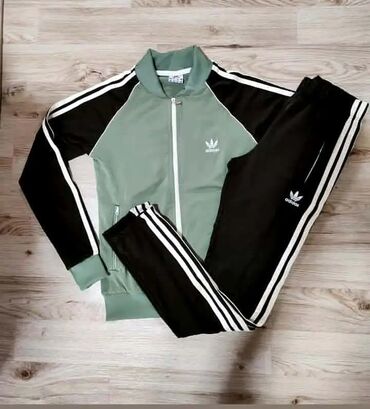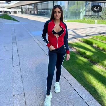 - Donji deo: uske trenerka-pantalone sa elastičnim pojasom, tri pruge duž nogavica i bočni džepovi sa rajsferšlusom. Diskretan logotip na butini.