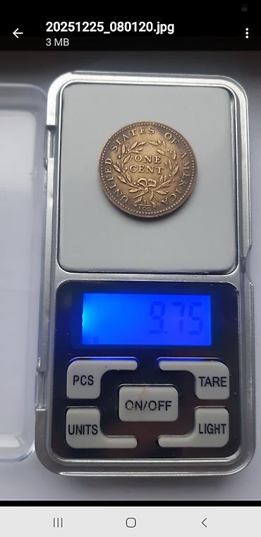 - Medaljon/žeton “Washington President” 1791: na aversu portret s natpisom WASHINGTON PRESIDENT i godina 1791; na reversu orao sa štitom, maslinovom granom i strelicama, natpis ONE CENT iznad. Prikazana masa na vagi: 12.20 g (fotografija merenja uključena).