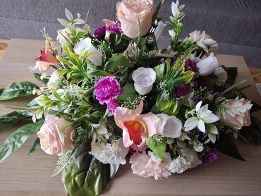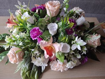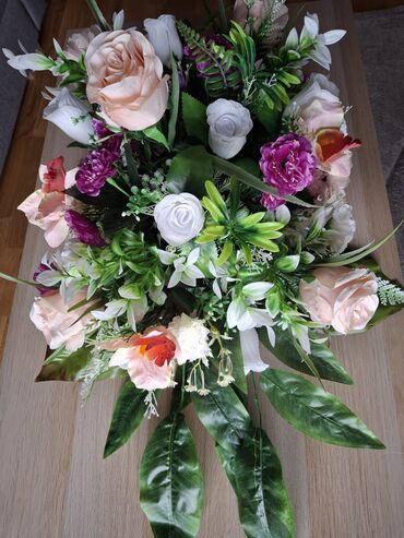 Dekorativni aranžman od veštačkog cveća – bogata, raskošna kompozicija idealna za sto, komodu ili ceremonijalne prilike.