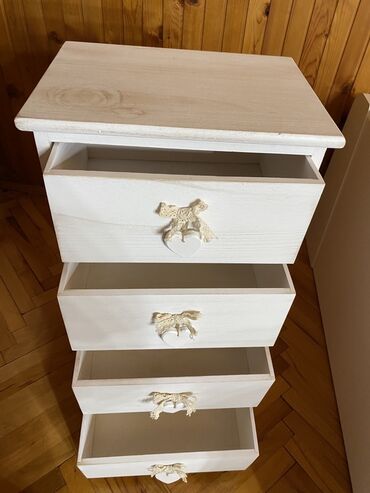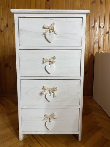 - Četiri prostrane fioke sa dekorativnim ručkama u obliku belih srca, vezane pletenim trakama od čipke/konca u boji lana.
