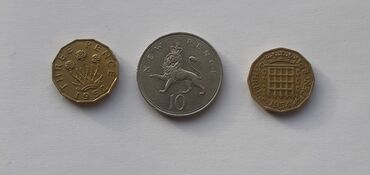 - Threepence (tri penija) 1953, dvanaestougaoni oblik, motiv cvetova (thistle/leek/clover) na aversu; portret monarha na reversu. Materijal: mesing (brass), karakteristično višestruko ivicasto sečenje.