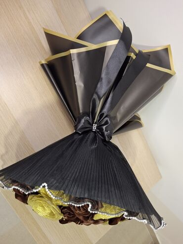 - Raskošan, ručno aranžiran buket sastavljen od ruža od satenskih traka u čokoladno-braon boji i ruža od zlatno-žute, sjajne mrežaste tkanine.