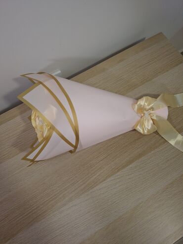- Aranžman smešten u dekorativnu, čvrstu rolnu od mat papira svetloružičaste boje sa zlatnim obrubom