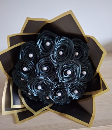 - Aranžman je upakovan u crni dekorativni papir sa zlatnim ivicama i satenskom trakom, za potpuni premium utisak.
