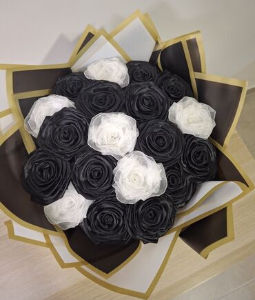 - Kombinacija 15+ crnih i belih ruža sa satenskim/organza efektom za luksuzan izgled
