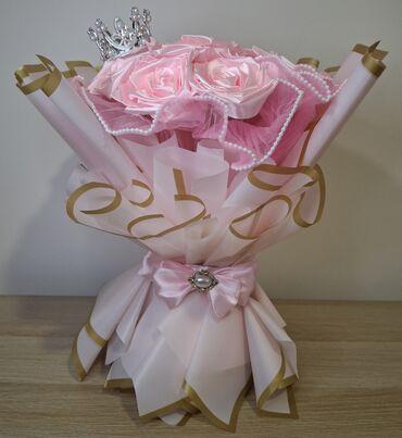 - Elegantno upakovan u mat roze poklon‑papir sa zlatnim rubom, u donjem delu ukrašen satenskom mašnom i brošem u obliku bisera.