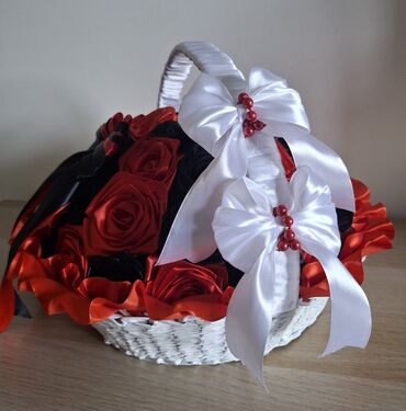 - Oivičenje korpe naglašeno naborenom crvenom satenskom trakom.
