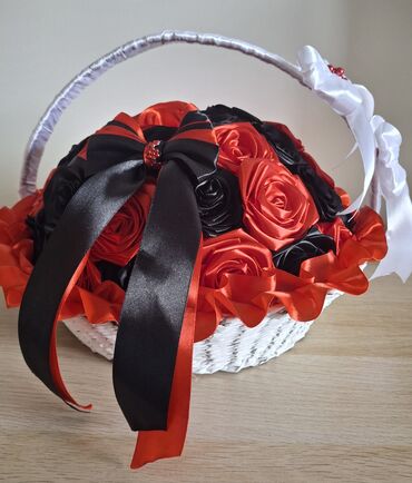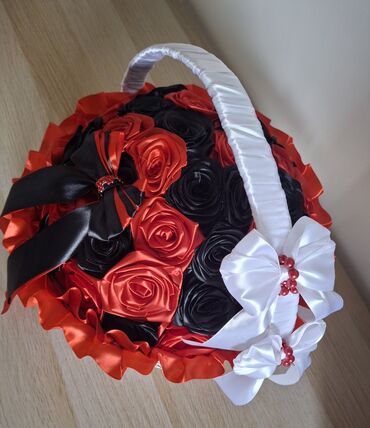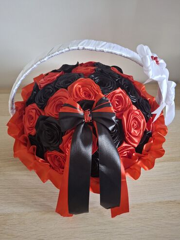 - Unutrašnjost ispunjena ružama od satenskih traka u crvenoj i crnoj boji, gusto poređanim u bogat buket.