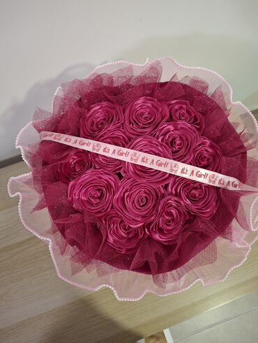 Rođendanska dekoracijaRučni buket od satenskih ruža – It’s a Girl