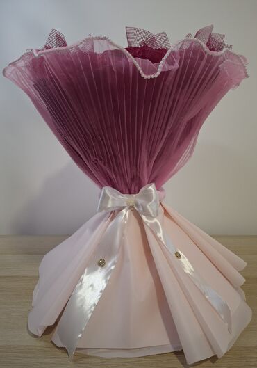 - Donji deo obložen svetloružičastim papirom/folijom, oblikovan u raskošnu „suknju“.
