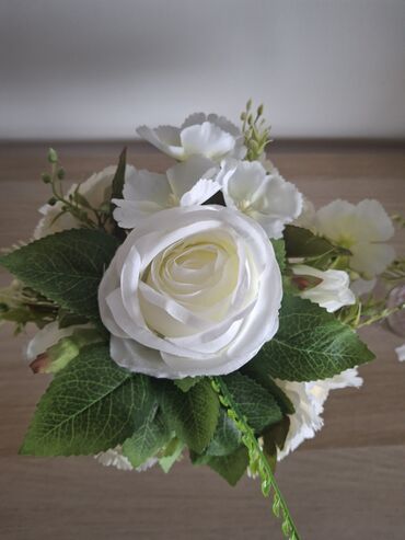 - Cveće: bela ruža kao centralni cvet, okružena karanfilima/ranunkulama u krem tonovima, sitnim belim cvetićima i zelenilom (listovi sa realističnom teksturom, pupoljci i grančice)