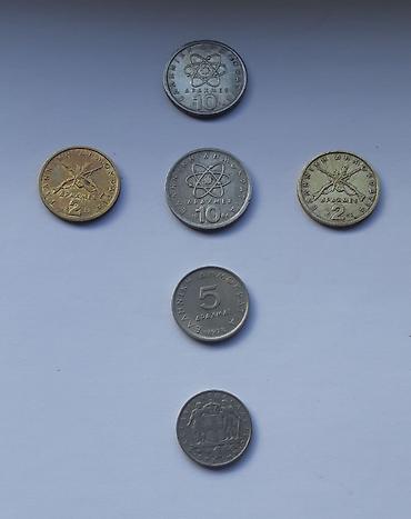 - 10 drahmi sa naučnim motivom atoma na reversu i portretom (npr. Demokrita) na aversu – 2 komada, različite godine.