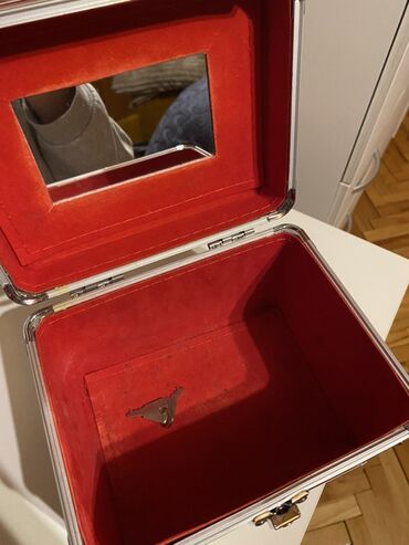- Unutrašnjost: podstava u crvenom veluru, ugrađeno pravougaono ogledalo u poklopcu