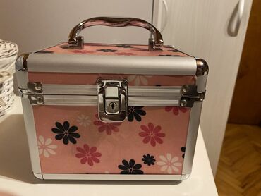 - Spoljašnjost: roze površina sa cvetnim printom; metalna ručka za nošenje