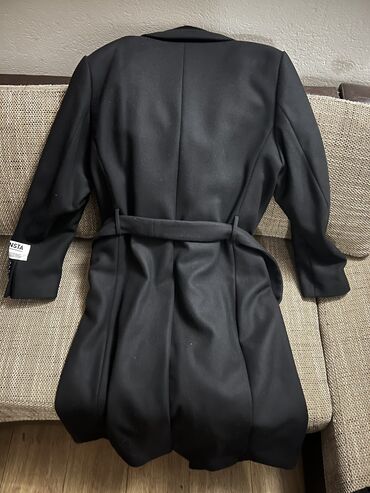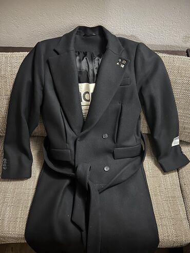Muški dugi kaput od vune, tamnoplave boje, sa klasičnim kragnom i pojasom za vezivanje u struku. Model je ravnog kroja, sa skrivenim kopčanjem na dugmad i bočnim ušivenim džepovima. Dužina ispod ko...