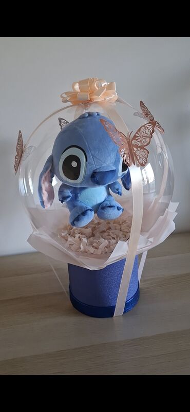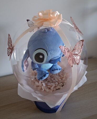 - Centralni motiv: mekana plava plišana igračka (lik inspirisan popularnim crtanim junakom) postavljena u providnom balon-aranžmanu.