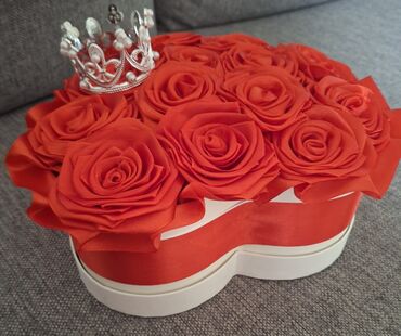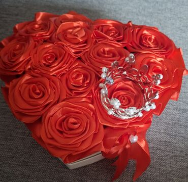 O trošku kupcaPoklon kutija u obliku srca sa crvenim ružama od satenskih traka i ukrasnom krunom.