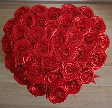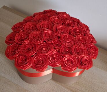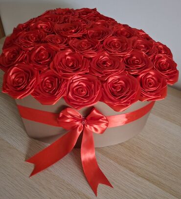 Poklon kutija u obliku srca sa aranžmanom crvenih ruža od satenskih trakica.